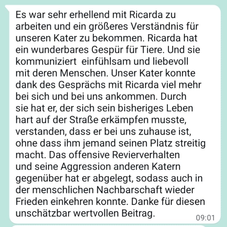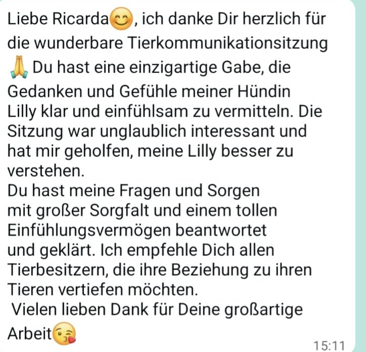 Die Tierkommunikation erfolgt intuitiv und verantwortungsvoll, mit einem feinen Gespür für Zusammenhänge und Dynamiken.